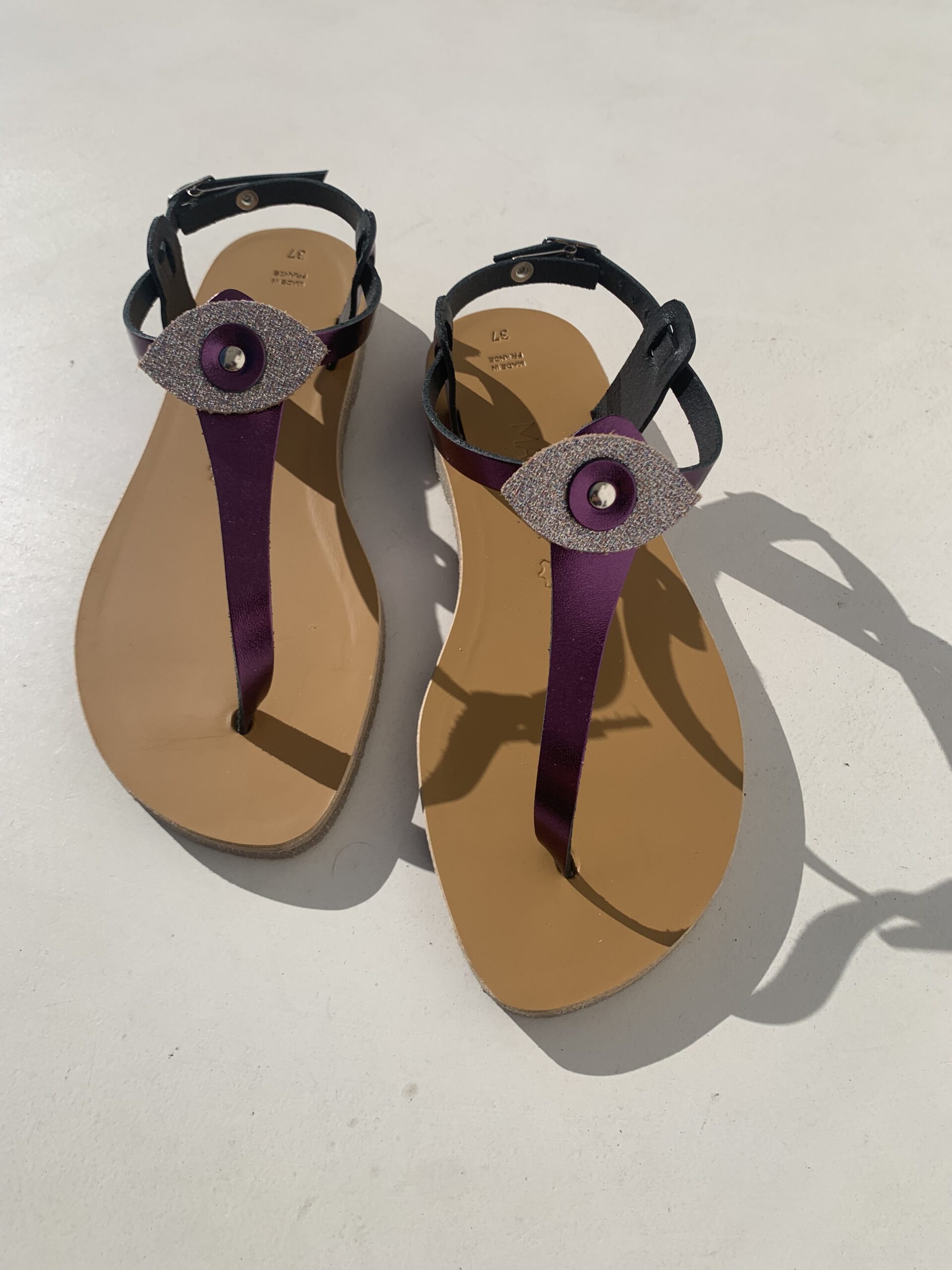 Les sandales Massalia sont entièrement dessinées et réalisées à la main en France avec des cuirs français de qualité qui sont des cuirs chinés dans des dépôts de cuir de luxe, ce qui explique également la rareté et biensur la qualité encore une fois.