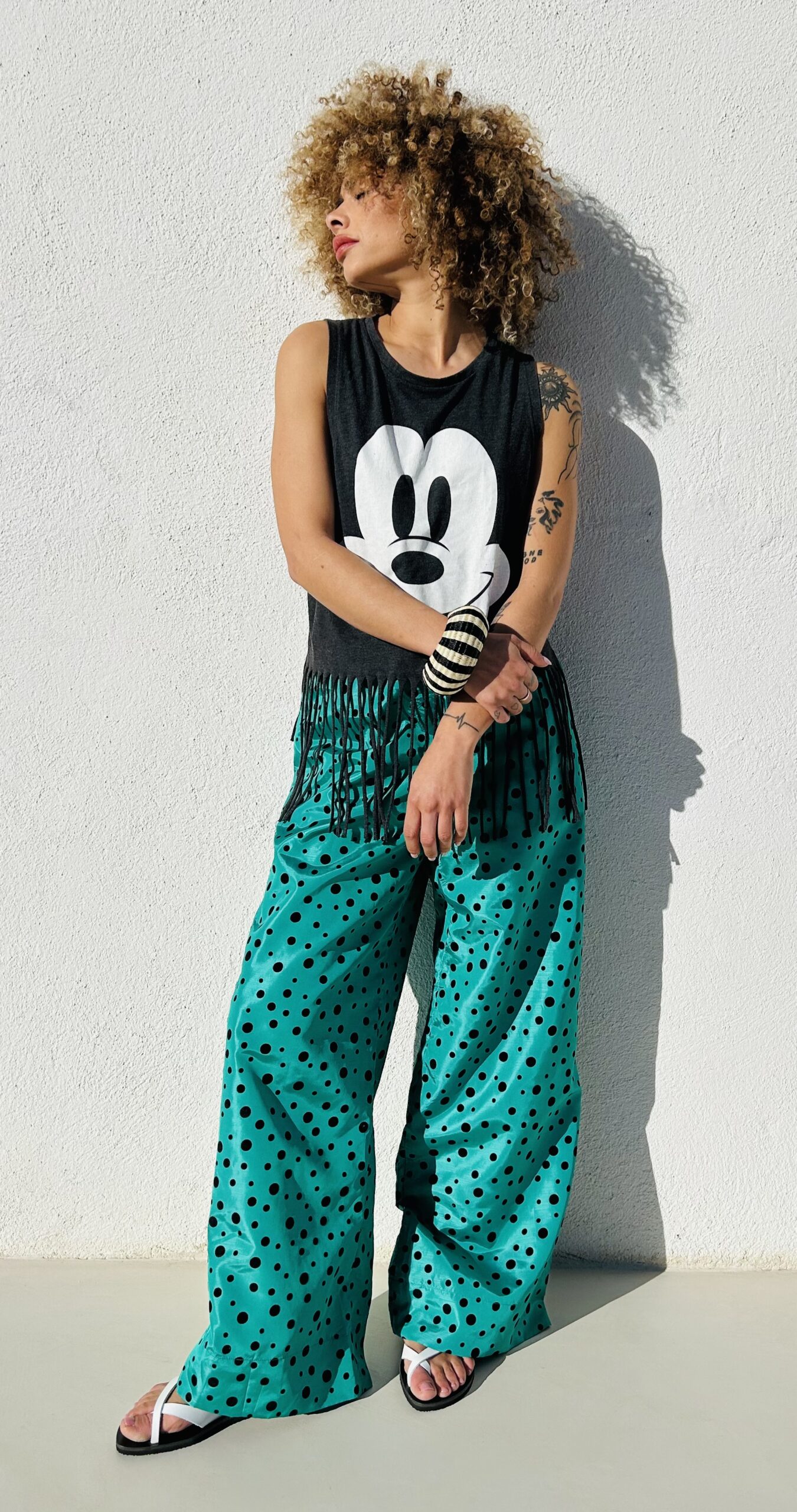 Je l’ai associé à un top frangé Mickey Mouse, fun et décalé, et à une veste damier aux petits tons roses, qui me rappelle un groupe de rock exceptionnel : Guns N’ Roses.