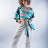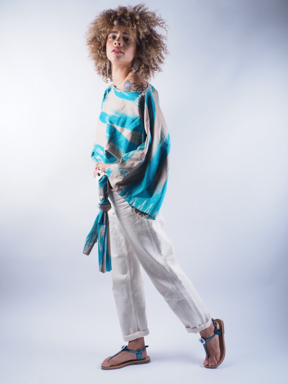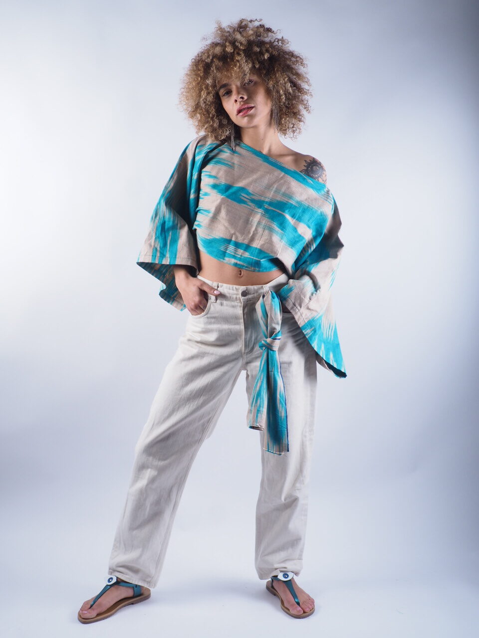 Pièce unique confectionné à la main avec un tissu que j’ai ramené de mon voyage au japon, au niveau du style je vous propose de le mettre simplement sur un jean ou sur robe noire en superposition cela très jolie aussi et bien sur n’oublions pas la paire de sandale MASSALIA que je vous suggère sur le look à savoir la IBIZA